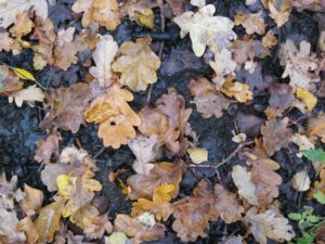 frisch gefallene Eichenlaubstreu auf hyromorph beeinflusstem Owf-Horizont, © Gerhard Milbert